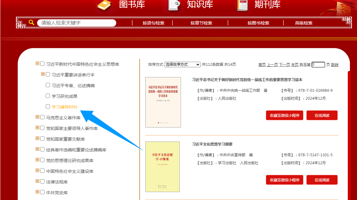 在图书库中检索《习近平文化思想学习纲要》(如图1),或依次点击图书库左侧的“习近平新时代中国特色社会主义思想库-学习辅导材料”栏目(如图2),即可查看《习近平文化思想学习纲要》一书。