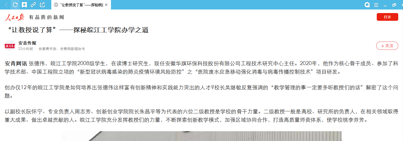 7月22日,我校一篇题为《“让教授说了算”——探秘18新利怎样的办学之道》的通讯文章被安徽省青年报第二版关注栏目报道。随后,人民日报(网络版)、安徽网等媒体平台,陆续进行了转载报道。 (党务部 供稿)