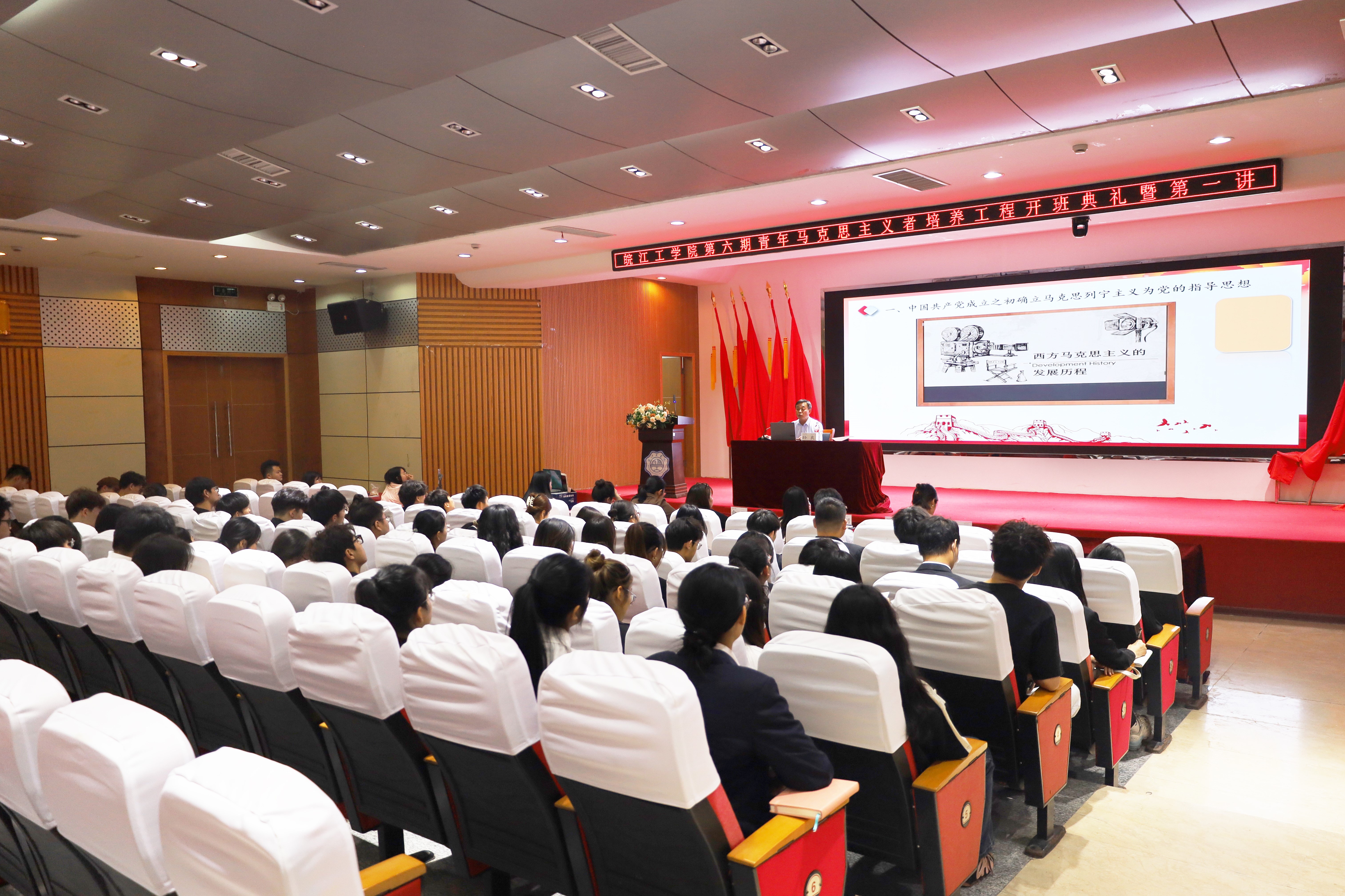 开班仪式在庄严肃穆的国歌声中拉开序幕,全体师生肃立,齐唱国歌。校团委组织宣传科副科长翟云霞向全体学员宣读此次培训的内容和目的。仪式由校党委副书记孙良宣布正式开班,并做主题为“追寻思想之光,照亮前行之路——学习践行中国共产党的指导思想”的第一讲。