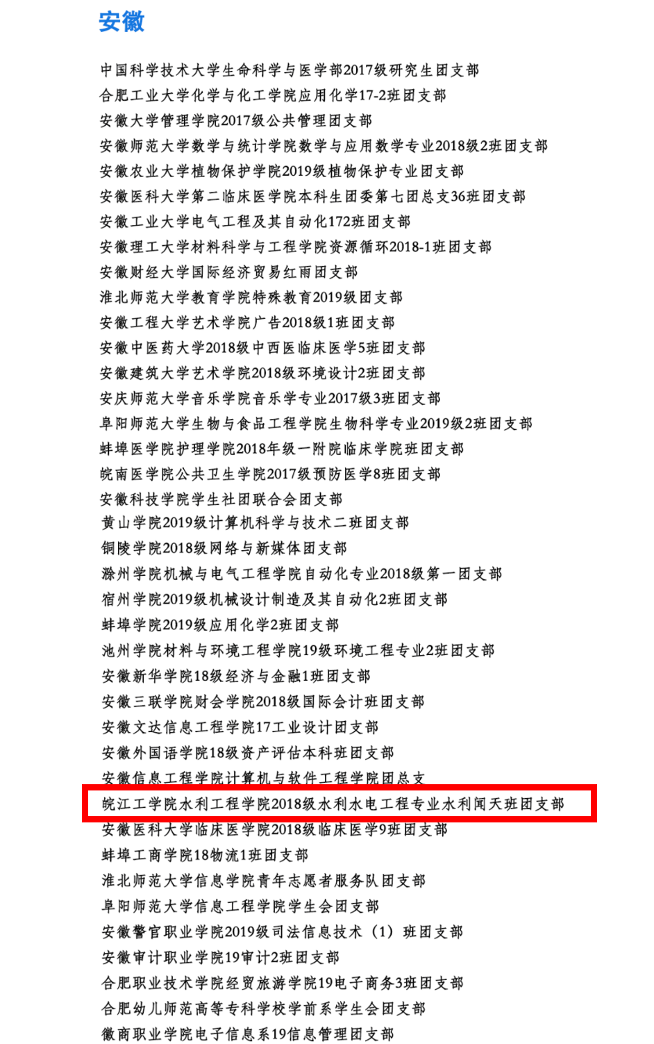 为深入贯彻落实“全团大抓基层”、“全团抓学校”部署,深化高校共青团改革,强化“一切工作到支部”理念,在团中央基层建设部指导下,中国青年报社开展“活力团支部炼成记”2020—2021学年高校活力团支部遴选及展示活动。1600所高校通过新媒体方式集中展示了在“党史学习教育”等方面的团支部建设成果和典型经验,1100万人次参与网络点赞。经校级申报、省级初评、展示点赞、全国终审、审核公式等环节,我校水利工程学院2018级闻天班团支部入选全国高校“活力团支部”。