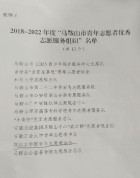 近日,由共青团马鞍山市委、马鞍山市青年志愿者协会印发《关于公布2018-2022年度“马鞍山市青年志愿者优秀个人”“马鞍山市青年志愿者优秀志愿服务组织”“马鞍山市青年志愿者优秀团组织”名单的通知》,我校青年志愿者协会荣获“马鞍山市青年志愿者优秀志愿服务组织”称号。