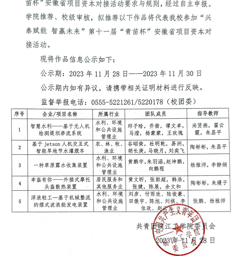关于我校参加“兴泰赋能智赢未来”第十一届“青苗杯”安徽省项目资本对接活动作品的公示 关于我校参加“兴泰赋能智赢未来”第十一届“青苗杯”安徽省项目资本对接活动作品的公示