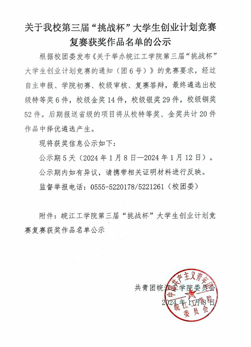 关于我校第三届“挑战杯”大学生创业计划竞赛复赛获奖作品名单的公示