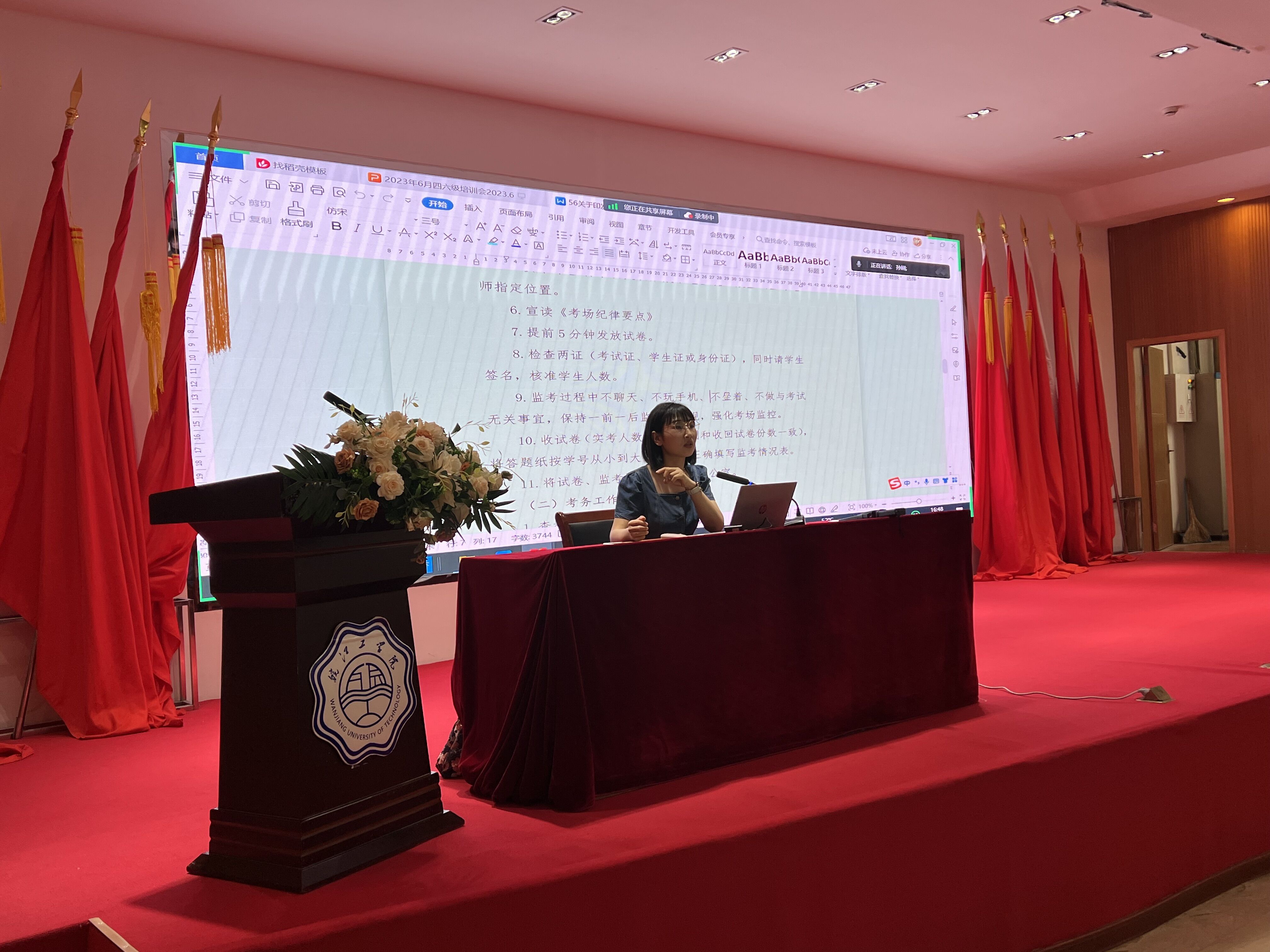 孙娴就此次我校四六级考试的报考情况和考场安排布置进行介绍。她从考试时间安排、考试前准备及要求、考试题型结构及材料介绍、考试进程及操作要点、试卷的封装及验收、监考职责、违规的认定和处理等方面进行全面讲解,要求监考老师明确考试各个环节,提醒考生做好考试准备,带好考试所需的相关物品, 顺利完成监考任务。