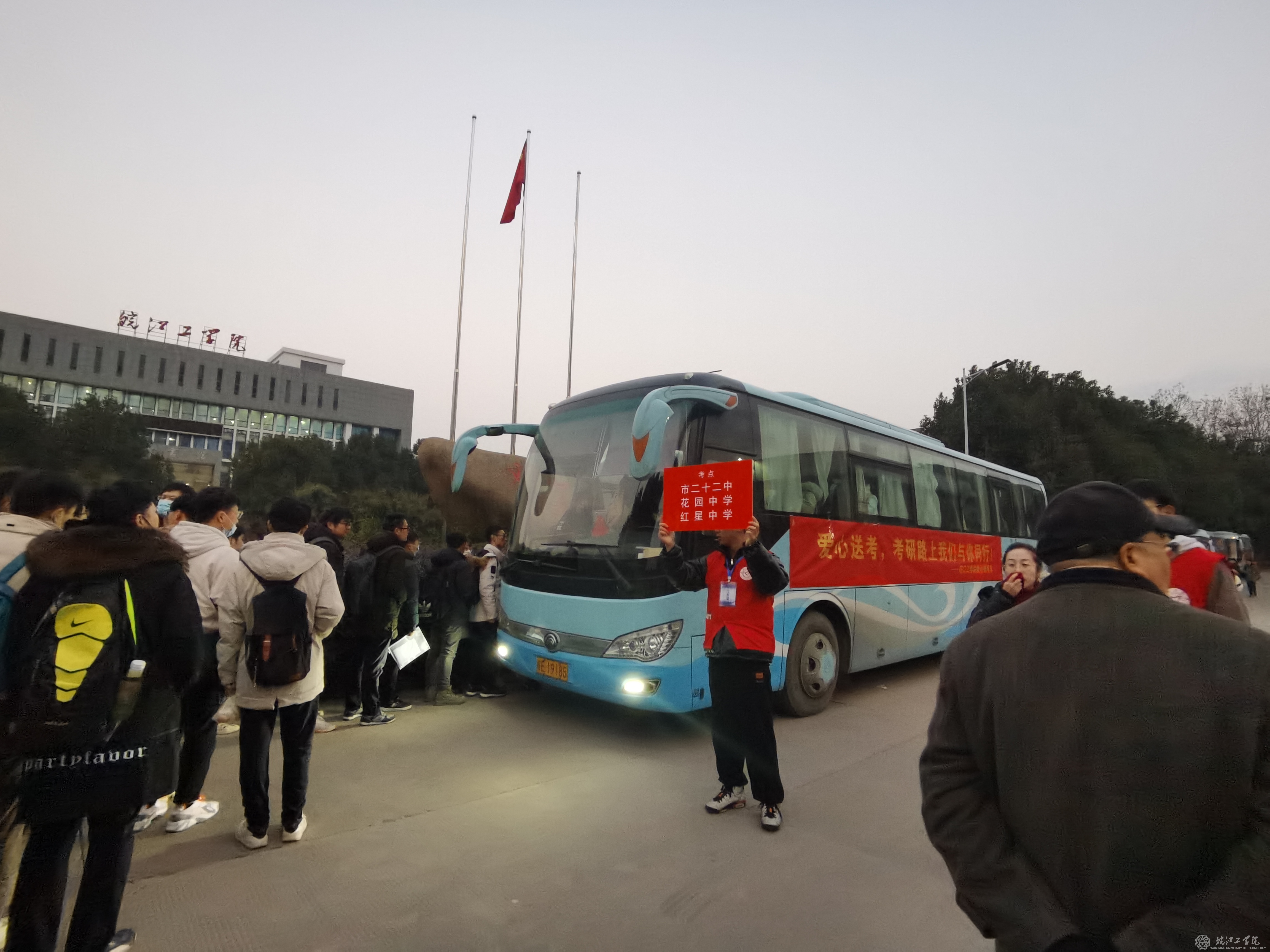 早上6时30分,3辆“爱心送考”校车和几十辆马鞍山爱心车队出租车在学校门口整装待发,学生志愿者们有的手中高举着“夺魁战鼓阵阵高,看我更上一层楼!”的标语给学长加油,有的在校门口志愿服务站为考研学子准备爱心早餐,有的在引导考生到指定车辆就坐……一杯温热的豆浆,两个热腾腾包子,一个鸡蛋给寒冷的冬天增添了温暖。