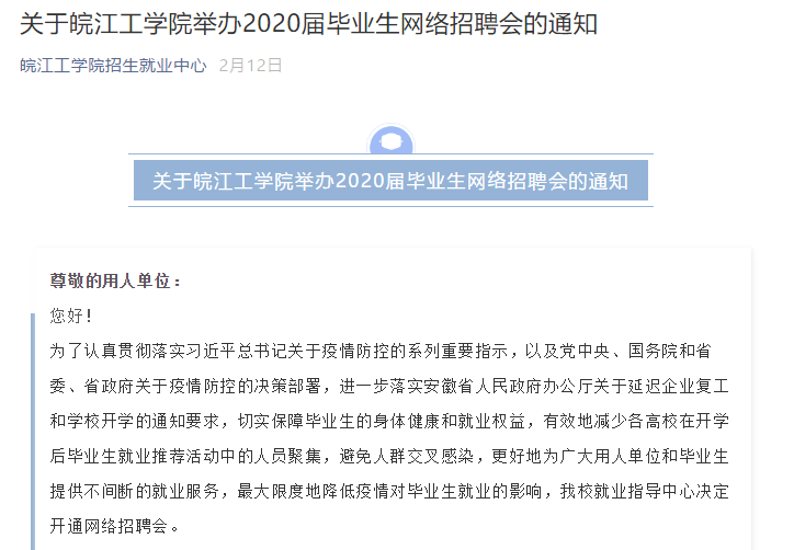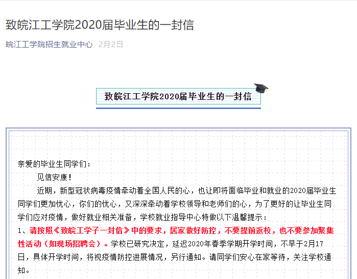 2月2日,学校就业指导中心迅速启动应急预案,及时通过学校就业网、微信公众号、QQ群等平台推送了《致18新利怎样2020届毕业生的一封信》。要求疫情期间毕业生们应做好居家防疫,并督促他们了解当前的就业形势,及时关注招聘信息,积极参与网络招聘。建议考研和考公的毕业生们及时关注相关招考通知。