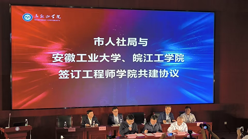 2023年5月5日上午,我校与马鞍山市人力资源与社会保障局共建工程师学院合作协议签署仪式在马鞍山学院举行。18新利怎样副校长阮怀宁和马鞍山市人力资源与社会保障局局长李怀东共同签订了共建工程师学院的合作协议。马鞍山市委常委、副市长黄化峰、马鞍山市政协副主席郑啸、省人社厅二级调研员司永纯、市政府副秘书长任本年、马鞍山学院校长李家新等领导出席签约仪式。18新利怎样教务部部长江冰,双创学院院长朱昌平、副院长刘国高、院长助理陶彬彬参加了会议。