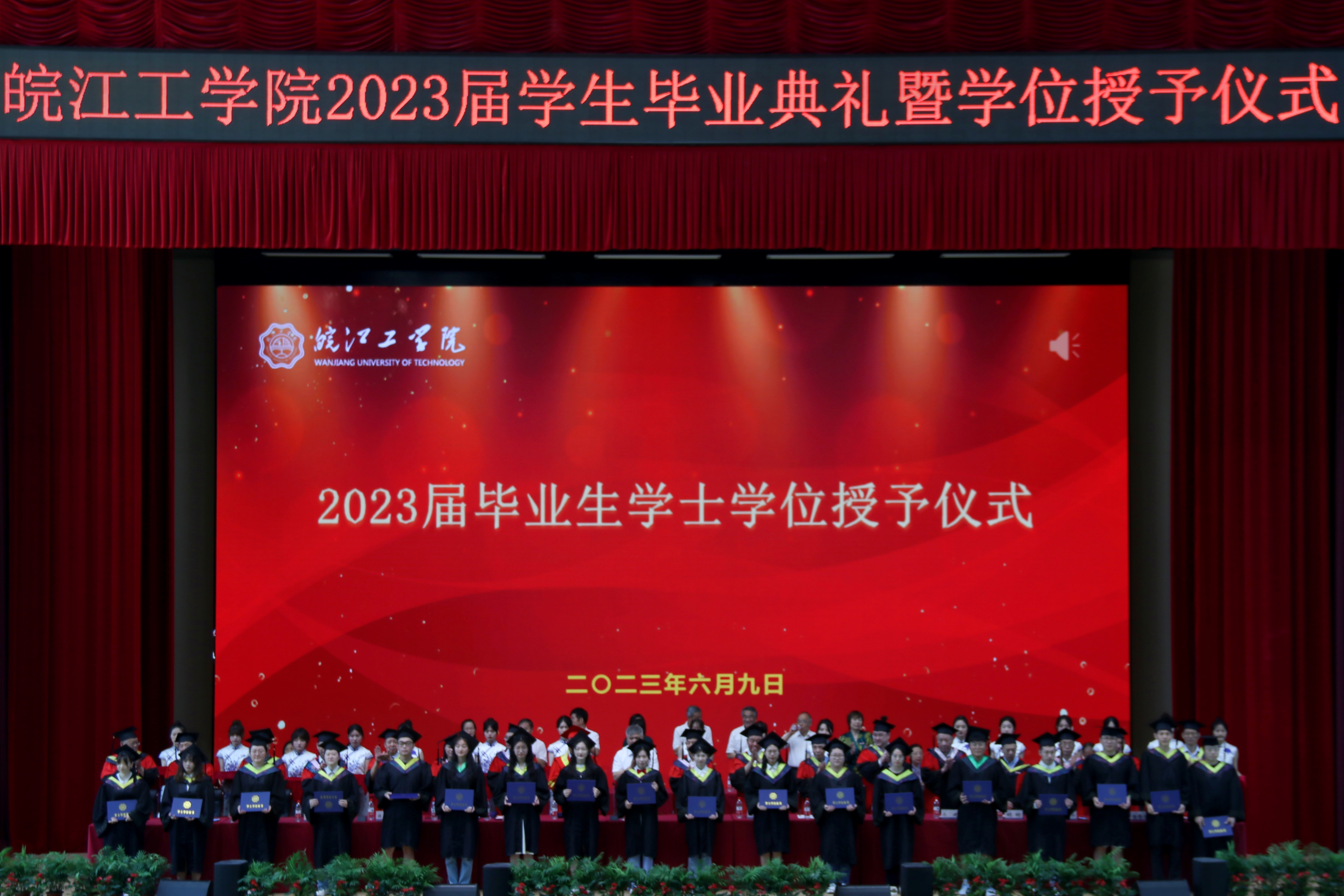 随后,在学士学位授予仪式上,各二级学院毕业生代表依次上台,校领导们为他们拨穗正冠、授予学位证书,并合影留念。