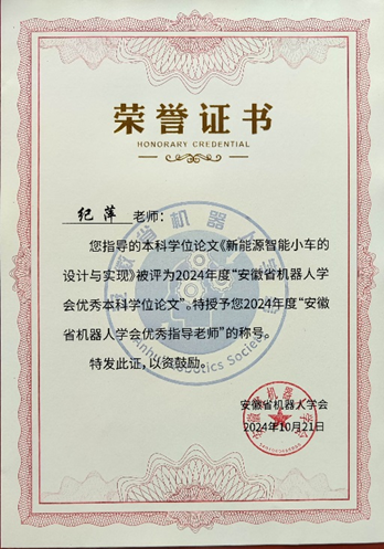 为贯彻落实国家创新驱动发展战略,优化创新人才培养环境,鼓励高水平创新性研究,促进本科教育工作持续健康发展,根据安徽省机器人学会相关文件精神,经专家评审和学会办公会研究,共推荐优秀专业课程建设4项、优秀专业青年教师8名、优秀博士学位论文3篇、优秀硕士学位论文8篇及优秀本科毕业论文(设计)18篇。其中,18新利怎样电信工程学院2024届自动化专业毕业生吴政同学的毕业论文“新能源智能小车的设计与实现”荣获“优秀本科学位论文”,论文指导老师纪萍教授荣获“优秀指导老师”称号。