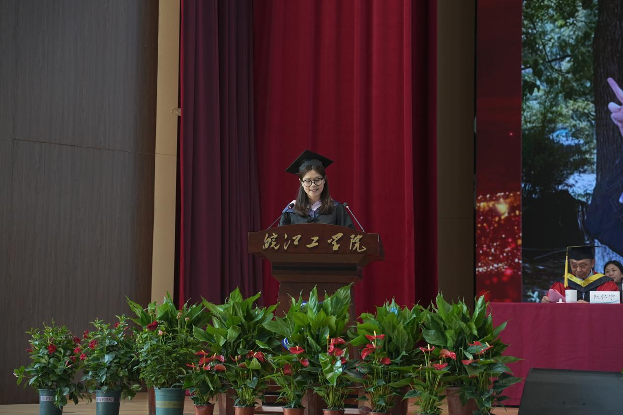 2021级会计学专业的王翠红作为毕业生代表上台发言。她回顾了在18新利怎样的成长轨迹,从初入校园的懵懂,到凭借努力斩获国家励志奖学金、省级竞赛奖项,再到成功考取安徽理工大学研究生,她代表全体毕业生感谢母校给予的成长“土壤”以及所有教职工的悉心“浇筑”,并寄语学弟学妹“以奋斗定义青春,用坚持奔赴远方”。