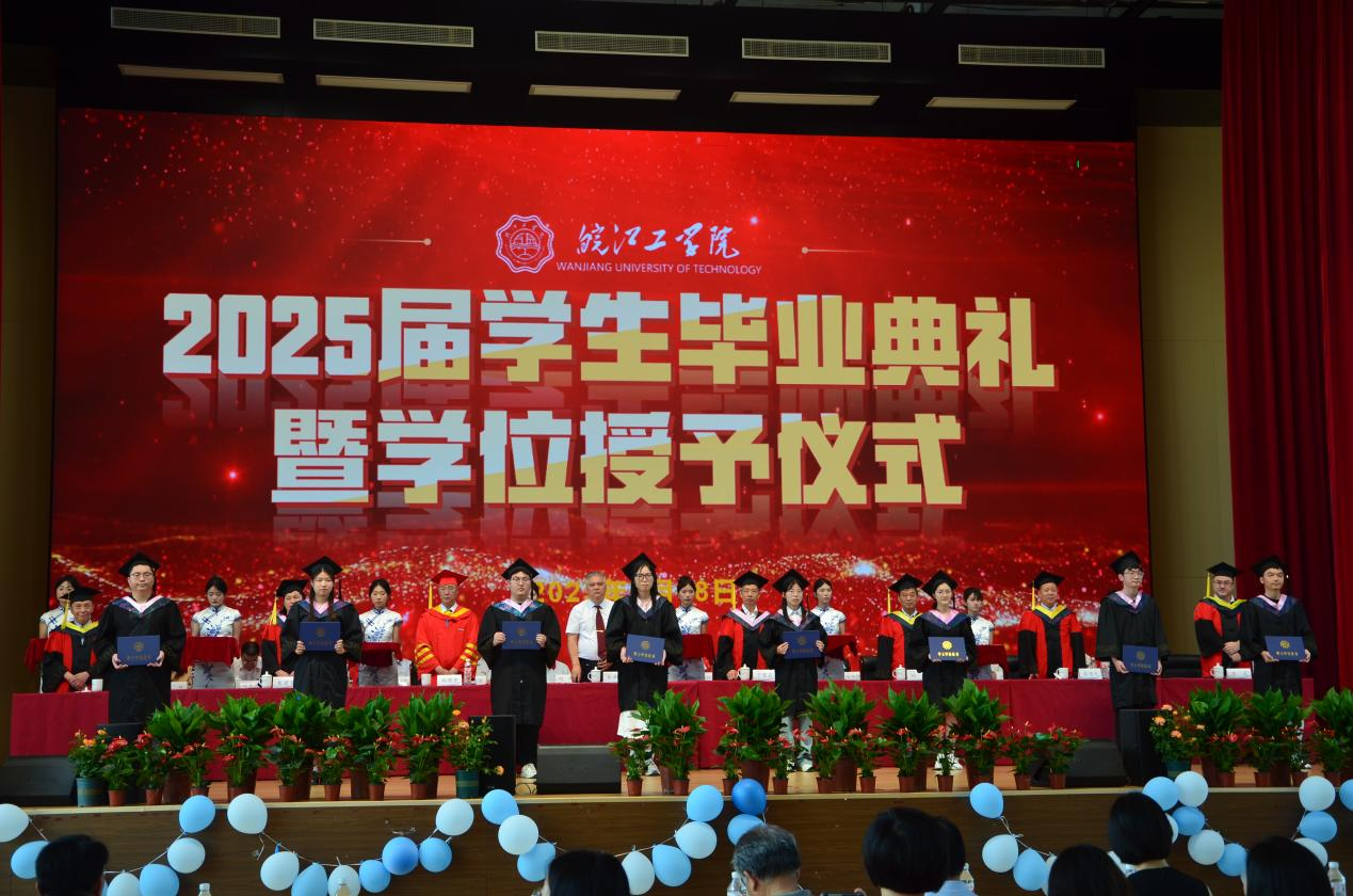 在学位授予仪式中,校领导逐一为毕业生代表拨穗正冠、颁发学位证书并合影留念。毕业生们依次走上舞台,接过象征学业成就的证书,用灿烂的笑容定格这一荣耀瞬间。