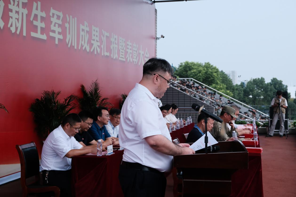 丁家云代表学校向辛勤付出的教官致以崇高敬意,向支持军训的老师诚挚问候,向圆满完成任务的同学热烈祝贺。他在讲话中指出,三周军训短暂充实,同学们顶烈日、冒风雨,以坚韧意志和协作精神交出优异答卷,既强健体魄,更在思想上受洗礼,纪律意识与集体荣誉感显著提升。要求同学们一要立德修身,以“国无德不兴,人无德不立”为指引,做诚实守信、有理想、懂感恩的品德高尚者;二要立学致知,将学习作为责任与追求,掌握科学方法,从大一开始规划职业生涯,夯实专业基础、提升综合素质,实现德智体美劳全面发展;三要知行合一,牢记“青年兴则国家兴”,勇担时代使命,探究真学问、练就真本领。最后他以“玉不琢,不成器;人不磨,不成才”寄语新生,希望将军训坚韧转化为学习生活动力,立大志、明大德、成大才、担大任。
