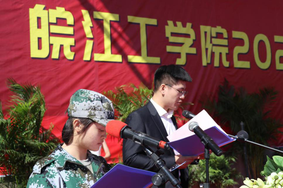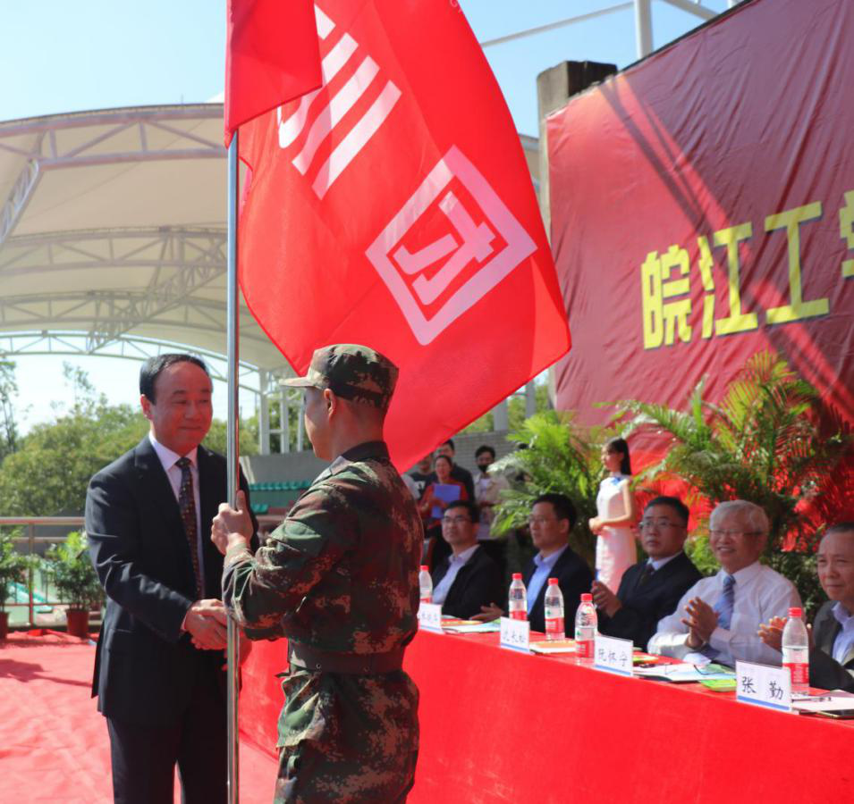 开学典礼结束后,侯进元宣读军训团成员名单,刘志祥向军训部队授旗。在迎风招展的红旗下,2020级新生开学典礼暨军训动员大会圆满结束。 (党务部 供稿)