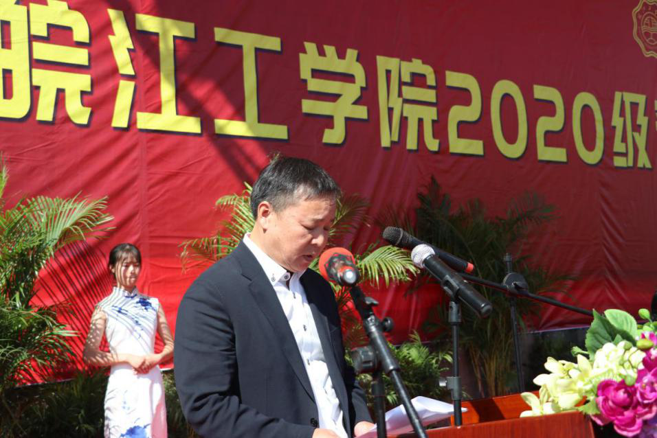 伴随着庄严而神圣的国歌,开学典礼正式拉开帷幕。吴继敏代表全校师生向2020级新同学表示最热烈的欢迎,对辛勤培养他们的家长和老师们致以最崇高的敬意,对来校指导军训工作的教官们表以最忠心的感谢。他说,前不久习近平总书记在全国抗击新冠肺炎疫情表彰会上为当代抗疫青年点赞,而他想为新生‘延期不误芳华季,答卷常怀赤子心’的拼搏精神点赞。在开启你们丰富多彩的大学生活之际,有一个很现实的问题需要重新思量,那就是如何做才能不负自己的大学时光。藉此,他给大家提出四点要求。一是要明确目标,脚踏实地。要尽快转变角色,融入大学生活,在新起点上做好人生规划,确立自己新的目标并要为此不懈努力。二是要学会做人、做事。作为新利体育手机端官网登录入口新人,要始终铭记“上善若水,笃学敦行”的校训。始终恪守社会对新利体育手机端官网登录入口人作风的普遍评价“宽厚、踏实、有责任感、有担当”。三是要不断完善自己,主动学习。“恰同学少年,风华正茂”,有老师指点,有同学切磋,有浩瀚的知识引路,可以心无旁骛的求知问学。四是学有所用。新生在平时要做到“知行合一”,才能将所学落到实处,实现为学的初衷。