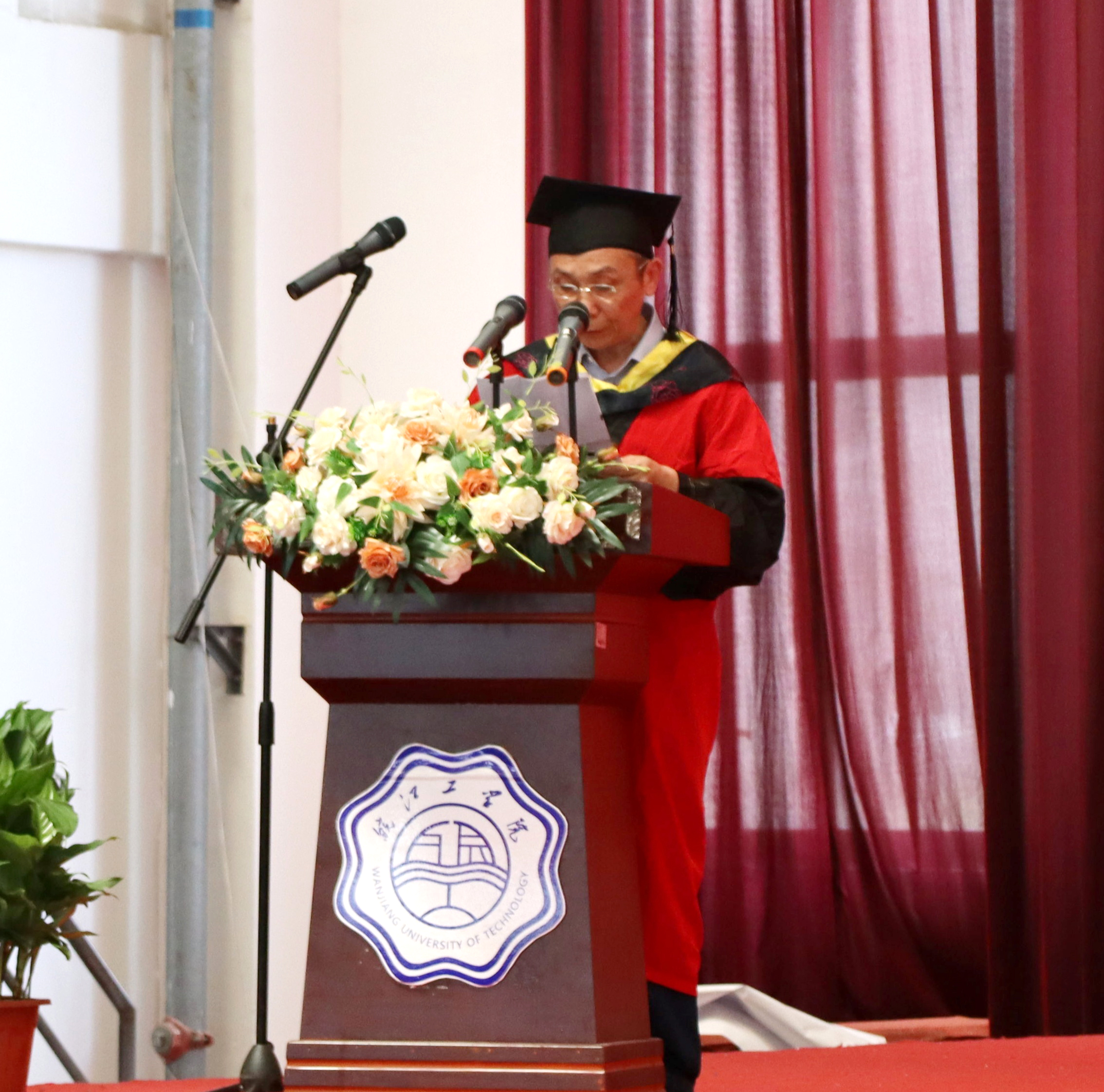电气信息工程学院院长乔晓华作为教师代表发言。他代表全体教衷心祝贺每一位毕业生顺利地完成大学学业。他诚挚地叮嘱同学们,不仅要学习做事的知识和技能,更要学习做人的道德修养;要热爱自由,但不可以随心所欲不循矩;要张扬个性,但不可以孤芳自赏不合群;要学会独立思考具有批判精神,但不可以自以为是目中无人;要有远大的抱负,但不可以好高骛远以事小而不为;要激情澎湃,但必须在理智指导下选择行为;要甘于寂寞,不断地学习进取;要敢于追求自己的幸福,但绝不能损害他人的利益;要心中装着多数人,但嘴上不可哗众取宠;要热爱生活,凡是从对方的角度思考问题。希望毕业生们为实现中华民族的伟大复兴和“两个一百年”奋斗目标,坚定地跟党走,做出自己最大的贡献。
