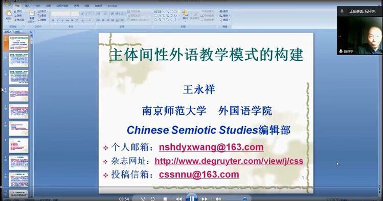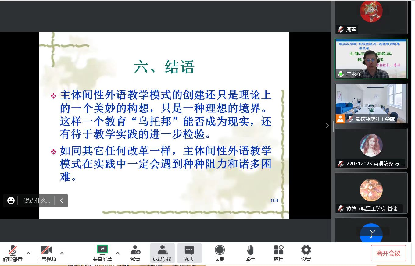 10月26日晚19点,南京师范大学外国语学院院长、博士生导师王永祥教授应邀在云端为我校英语教师做题为“主体间性外语教学模式的构建”的讲座。本次讲座主题为“科技活动月---外语教师培养与发展”,由校科技部和教师发展中心联合主办,基础部承办,外语教学与研究出版社协办。副校长、博士生导师阮怀宁教授和我校基础部全体英语教师参加讲座,讲座由基础部外语教研室主任彭饮冰主持。