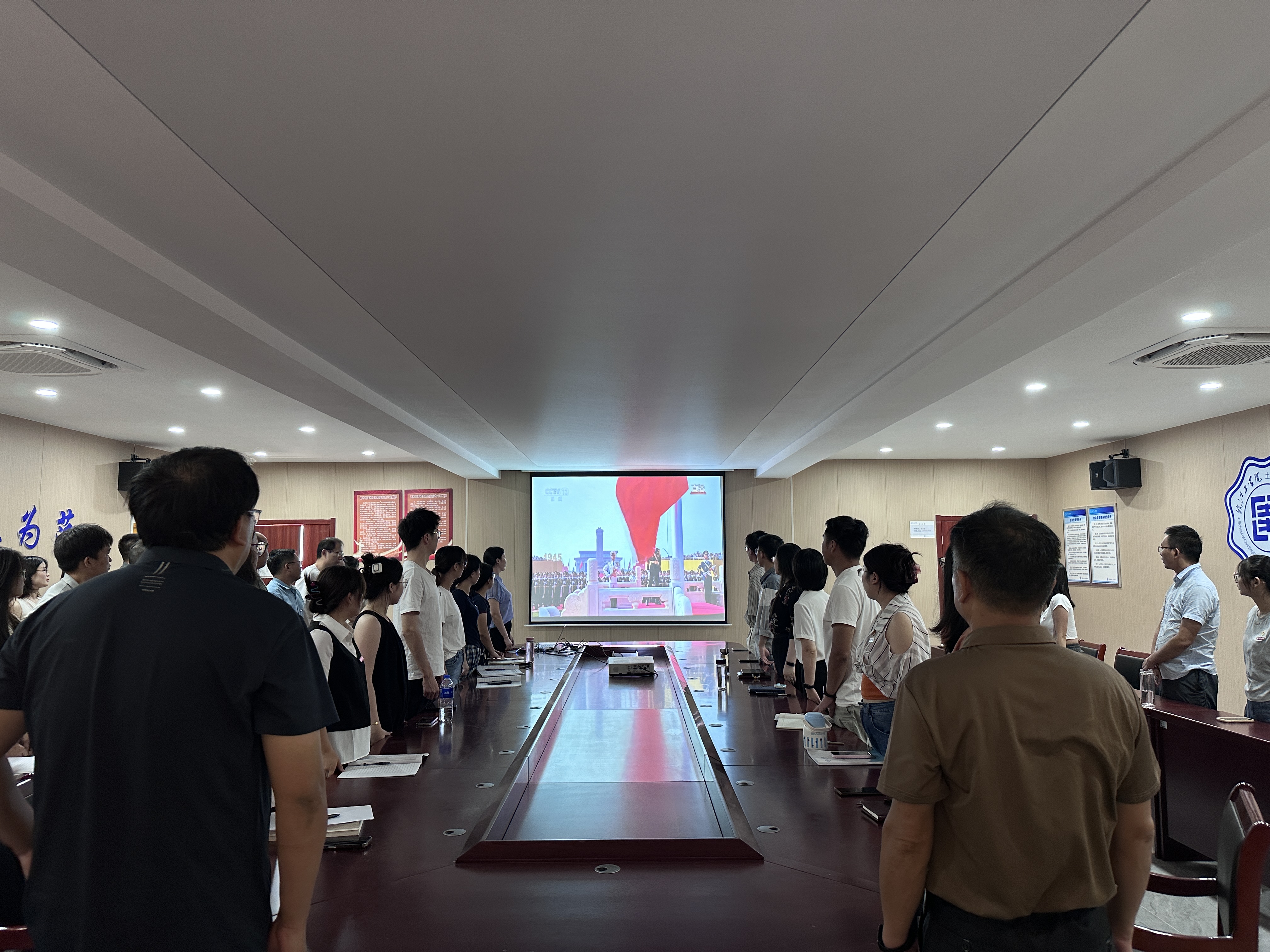 当庄严的国歌声响起,全体教职工自发起立,齐声高唱国歌,目光坚定地注视着屏幕中的国旗,心中充满了对祖国的无限敬意。