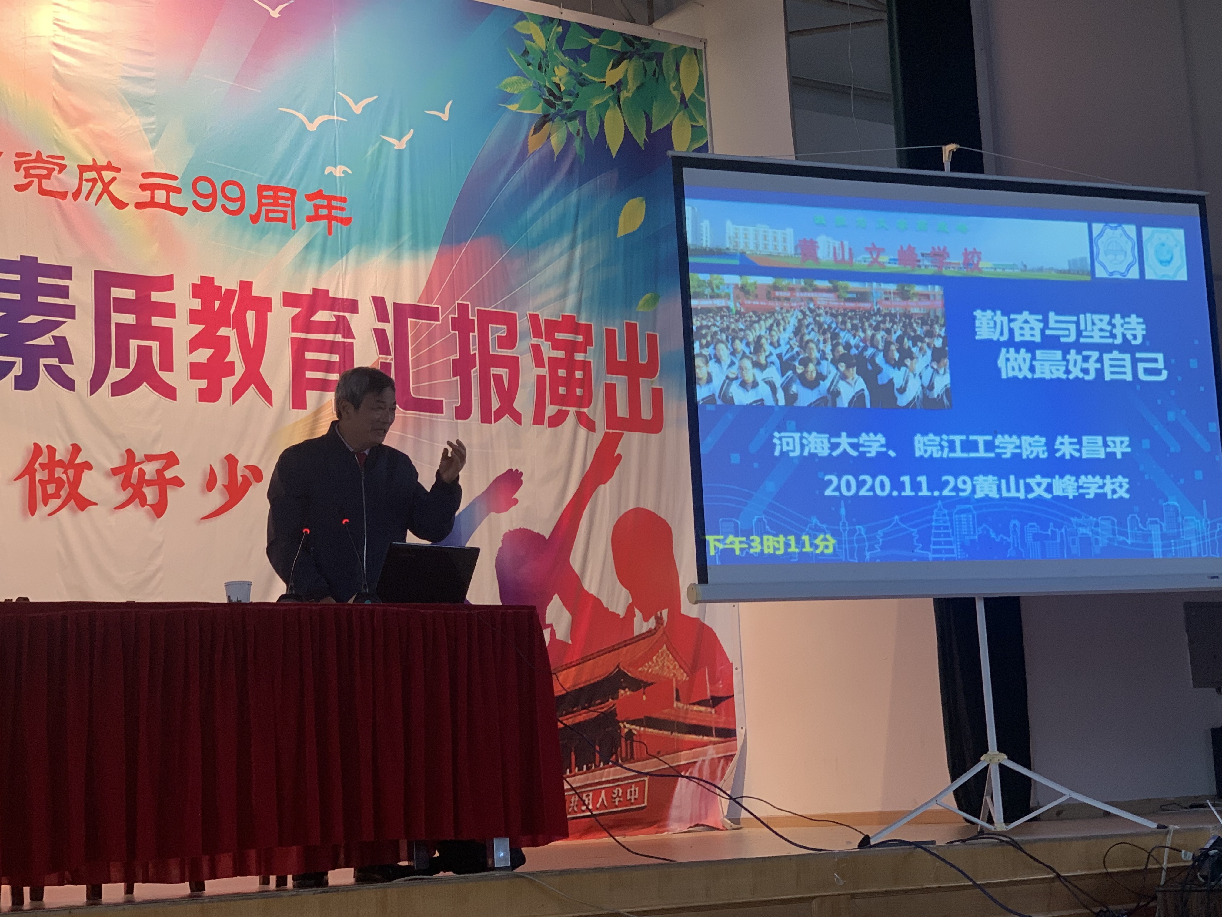 为加大我校招生宣传力度,不断提高本科生生源质量,11月29日,由我校学工部主办,土木工程学院协办的“专家进高中”讲座走进黄山市文峰学校。我校双创学院院长朱昌平教授受邀赴该校进行招生宣传,学工部招生科科长印志媛,土木工程学院招生教师丁东升及两名19级学生陪同前往。朱昌平教授一行受到黄山市文峰学校师生热烈欢迎。