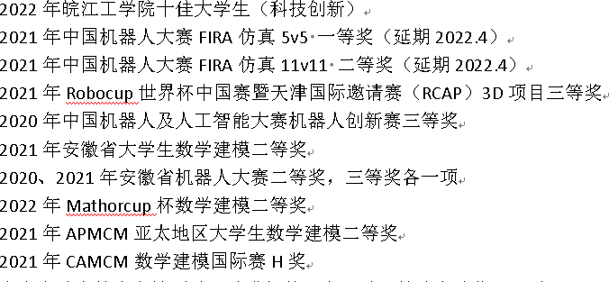 二等奖、2020 年世界杯中国赛暨天津国际邀请赛(RCAP)3D 项目三等奖、2021 年 APMCM 亚太地区数学建模二等奖、2021 年 CAMCM 数学建模国际赛(小美赛)H 奖。进入大学之后,工作期间尽职尽责,圆满完成任职期间本实验室各项比赛活动。