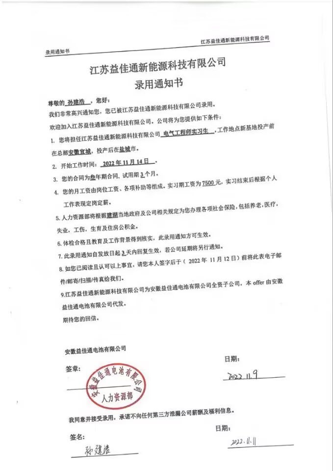 我是18新利怎样自动化 2023 届孙建浩, 我高中毕业于临泉二中。大四上就被江苏益 佳通优录,包吃包住,基本生活开销公司全包, 另外实习月薪 7.5K+,转正 8 K+,在企业主要从事项目研发。我能被企业优录,得益于大学 期间学校的精心培养。我们学校为学生实践 创新创建了良好的条件,所有热爱创新实践的同学均能加入双创学院。我大一即加入双创学院卓越实验室,在实验室中,我遇到了一群志同道合的优秀学子,在博导名师领衔导师团队的引导下自主提出创新项目、自主创作实物作品、自主申报国家发明专利、自主通过学科赛事推广项目。我大学期间共完成大创项目 5项,获得国家受理发明专利 3 件,获得互联网+等学科赛事省级及以上奖励 9 项。由衷感谢学校为我们提供了优质教学条件,感谢学校老师们认真授课,感谢双创学院导师们全天候陪伴引导我们实践。我将永远珍视这段美好的经历,潜心建设国家,用实际行动回报母校的培养。
