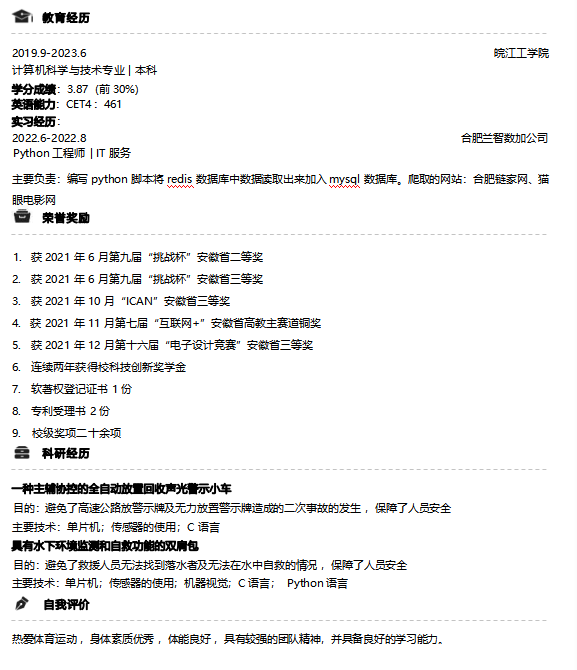 我是18新利怎样计科2023届毛连瑞,我高中毕业于淮南市凤台一中。目前在准备事业单位的应聘,希望可以留在家乡工作,在家乡发光发热。我大二上学期即加入学校双创学院卓越实验室,在实验室中,感受到了实验室大家庭的温暖,也感受到了老师对我们的耐心指导。在实验室我实际动手完成了大创项目,学习了项目开发的基本技术,获得校级奖励2项,省级挑战杯等学科赛事奖励1项。非常感恩学校为我们开展工程实践提供了良好的条件,老师一丝不苟、尽心尽力培养我们。让我在大学里我度过收获满满的大学时光,真诚祝愿我们的学校和老师万事胜意。