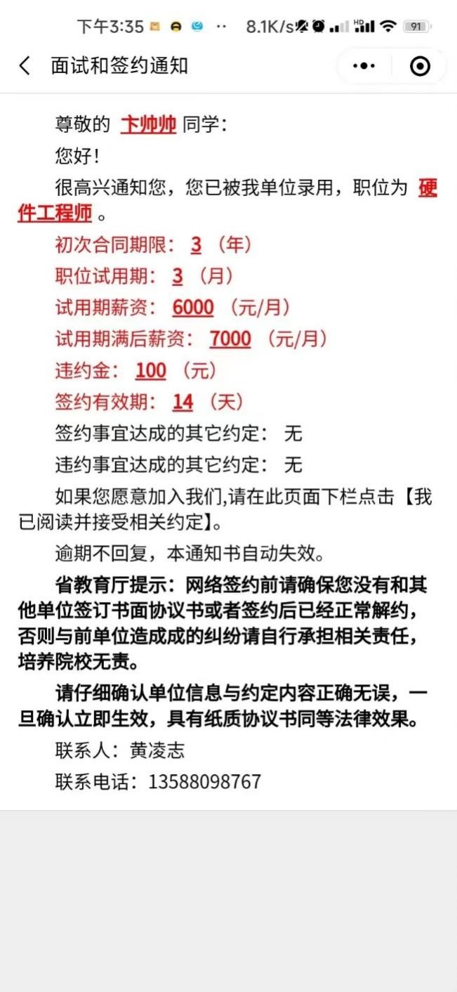 我是18新利怎样电气工程及其自动化2023届毕业生卞帅帅,我高中毕业于亳州第十八中学。我已在杭州已通过了三家公司的选拔,分别是从事硬件设计、电气工程师相关领域。电气工程师的待遇是7k *15薪。我能找到心仪的工作,首先,我要感谢18新利怎样为我提供了优质的教育资源。在校期间,我接受了系统、专业、全面的教育,为我今后的工作和生活奠定了扎实的基础。这些基础知识是我在即将面对职场挑战时的坚实后盾。学校重视学生工程实践能力培养,我是大三下加入学校双创学院卓越实验室做毕业设计,导师要求不仅要设计出电路,还要做出实物作品。在毕业设计中,使我不仅获得了更多的专业知识,动手能力也得到提高。衷心感谢学校鼎力支持学生开展工程实践,老师默默付出的辛勤劳动和无私奉献。未来我将继续努力,用行动感谢您们为我所做的一切!