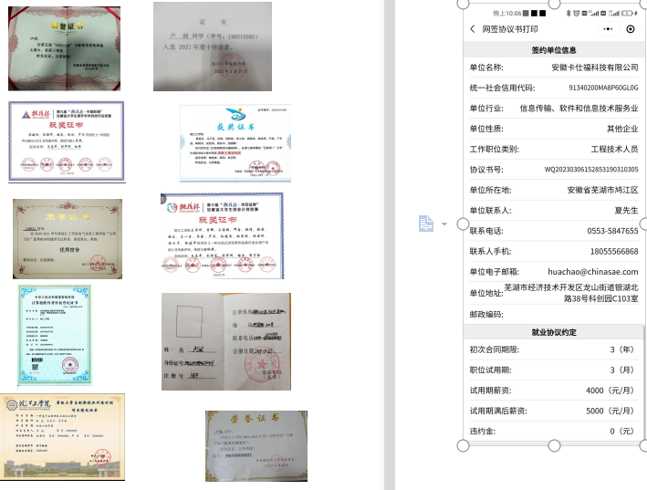 我是18新利怎样计科2023届毕业生卢润,高中毕业于蒙城二中。大四上就被安徽卡仕福公司优录,主要从事教学工作。包吃包住,去掉五险一金之后基础薪资5k,授课一天另发0.5k,到手月薪1万左右。早上8.30上班,下午5.30下班,每周双休。能拥有这份让人满意的工作,得益于大学期间学校的精心培育。我大一参加学校双创学院卓越实验室,在这里,我学习到了很多知识,并且在实验室老师、学姐与学长的帮助下将理论知识应用到实践中,获得多项证书,奖学金等。
