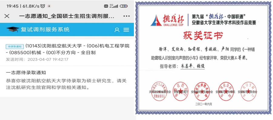 我是18新利怎样 2019 级车辆工程孙前程,我高中毕业于阜阳市临泉县第二中学。目前成功上岸沈阳航空航天大学。我能被沈航录取,得益于大学期间学校的精心培养以及自己的不懈努力。我大二即加入学校双创学院卓越实验室,在实验室中,我和项目组同学自主完成大创项目 1 项,项目不仅做出了实物作品,还获得国家受理发明专利 1 件,获得互联网+等学科赛事省级及以上奖励 3 项。感谢学校一直重视学生工程实践能力的培养,积极为学生不断改善学习条件。感谢老师的辛勤付出、悉心教诲。接下来我将铭记恩师教诲和“上善若水、笃学敦行”的校训,在研究生阶段继续努力学习,不负大学期间学校和老师的精心培养。