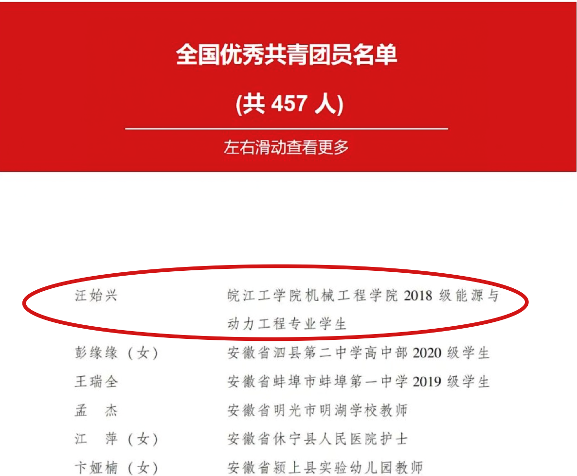 首登全国榜!我校汪始兴同学荣获2021-2022年度全国优秀共青团员称号