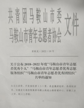 近日,由共青团马鞍山市委、马鞍山市青年志愿者协会印发《关于公布2018-2022年度“马鞍山市青年志愿者优秀个人”“马鞍山市青年志愿者优秀志愿服务组织”“马鞍山市青年志愿者优秀团组织”名单的通知》公布,我校青年志愿者协会荣获“马鞍山市青年志愿者优秀志愿服务组织”称号。