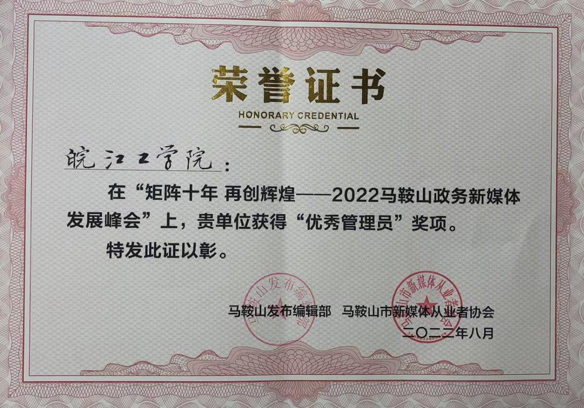 8月8日,由中共马鞍山市委宣传部、中共马鞍山市委网信办主办,马鞍山日报社、马鞍山新媒体从业者协会承办的“矩阵十年 再创辉煌”——2022马鞍山政务新媒体发展峰会召开。会上,我校荣获2022年“优秀管理员”奖。