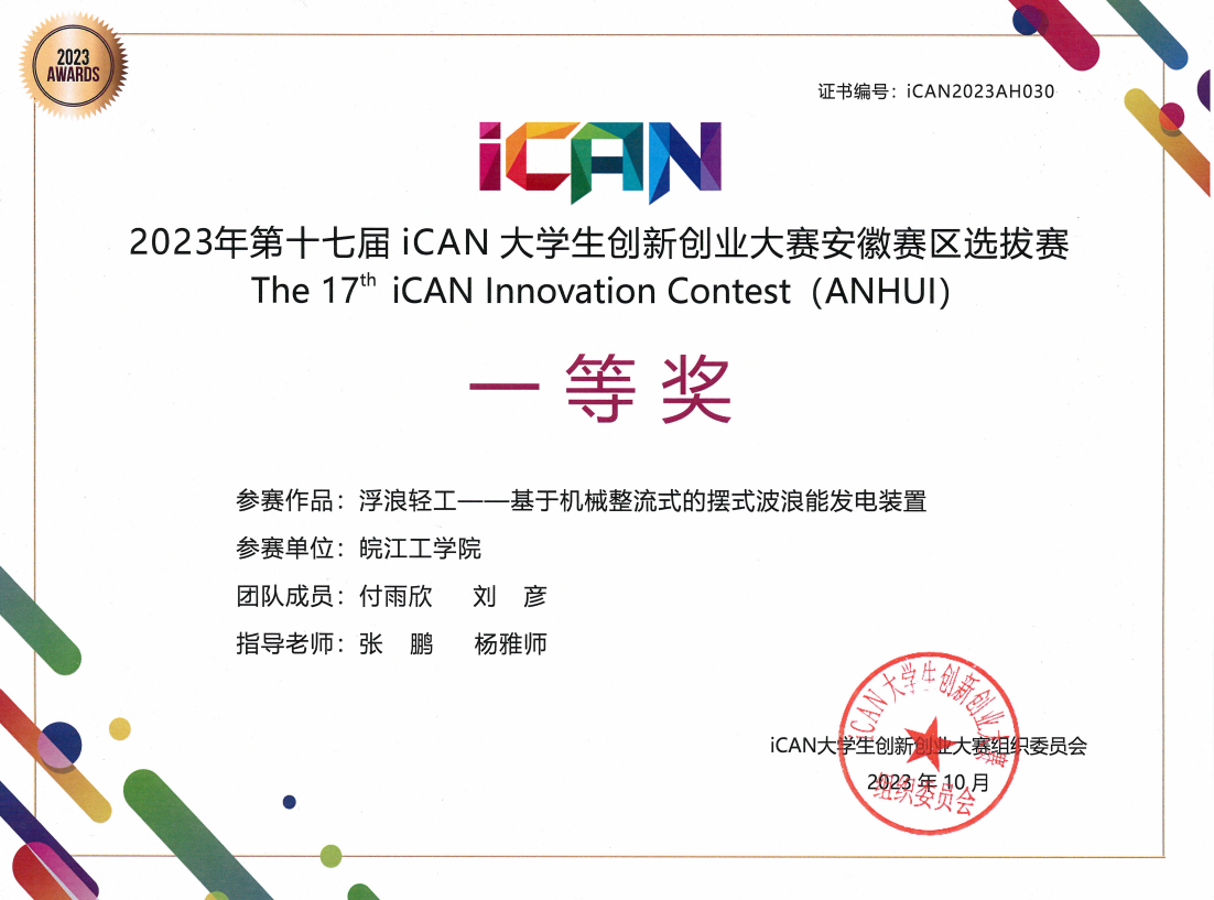 2023年3月22日,中国高等教育学会公布了教育部认可度最高的84项高校学科赛事,iCAN大学生创新创业大赛排序54,我校一直积极参加iCAN国际创新创业教育联盟的各项活动。2023年有60支队伍、300多名同学报名参赛,经过学校选拔赛,有25支队伍、近150名同学入围第十七届iCAN大学生创新创业大赛安徽赛区选拔赛决赛,我校在省决赛中荣获一等奖3项、二等奖8项、三等奖14项。3支队伍将于2023年12月赴北京奥林匹克塔参加全国总决赛,我校陶彬彬、朱正阳、张鹏、杨雅师、朱昌平五位老师荣获优秀指导教师奖,我校荣获优秀组织单位奖。