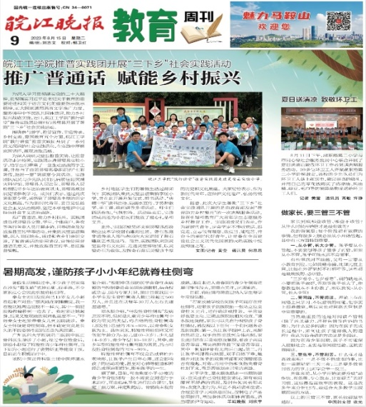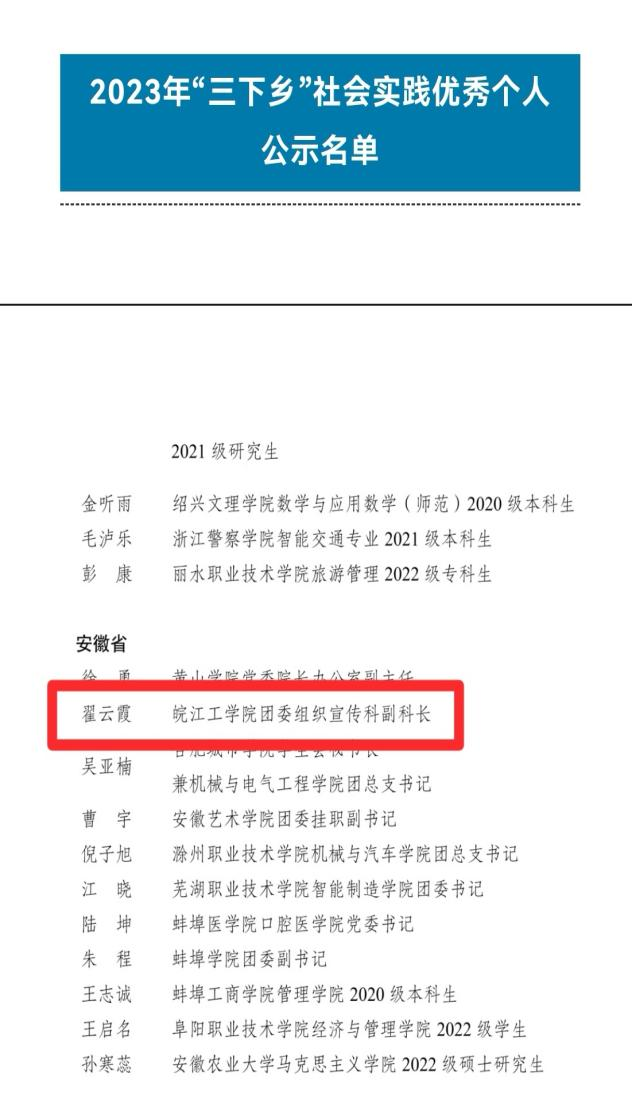近日,共青团中央公布《2023年全国大中专学生志愿者暑期文化科技卫生“三下乡”社会实践活动总结通报结果》,经基层申报、省级团委审核推荐、组织评议等环节,最终确定283名“三下乡”社会实践优秀个人,安徽省共11人获得该项荣誉,我校“敦行讲堂”推普助力乡村振兴实践团和“红色筑梦”赴舒城县暑期社会实践团的指导教师翟云霞获评团中央授予的“优秀个人”称号。