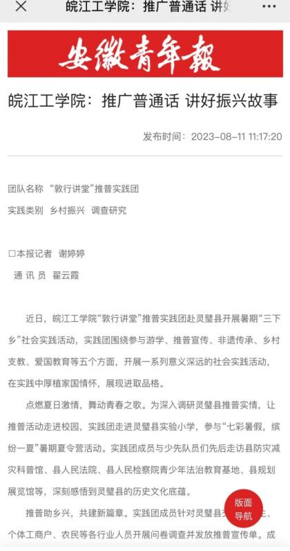 为总结实践成果,她积极带领学生撰写新闻稿、调研报告,拍摄微团课、微视频等,参与各类新闻报道发表共计26篇。其中国家级平台:学习强国、中青校园等12篇;省级平台:安青报等7篇;地市级平台:灵璧共青团、舒城共青团、18新利怎样等共7篇;纸媒1篇(皖江晚报);创立“敦行讲堂”推普实践宣讲团微博账号并官方认证,受中国教育电视台官方微博转载并点赞,浏览量达4万。根据推普助力乡村振兴设置调查问卷并回收1000份,带领团队学生撰写的调研报告成功投稿中青校园。