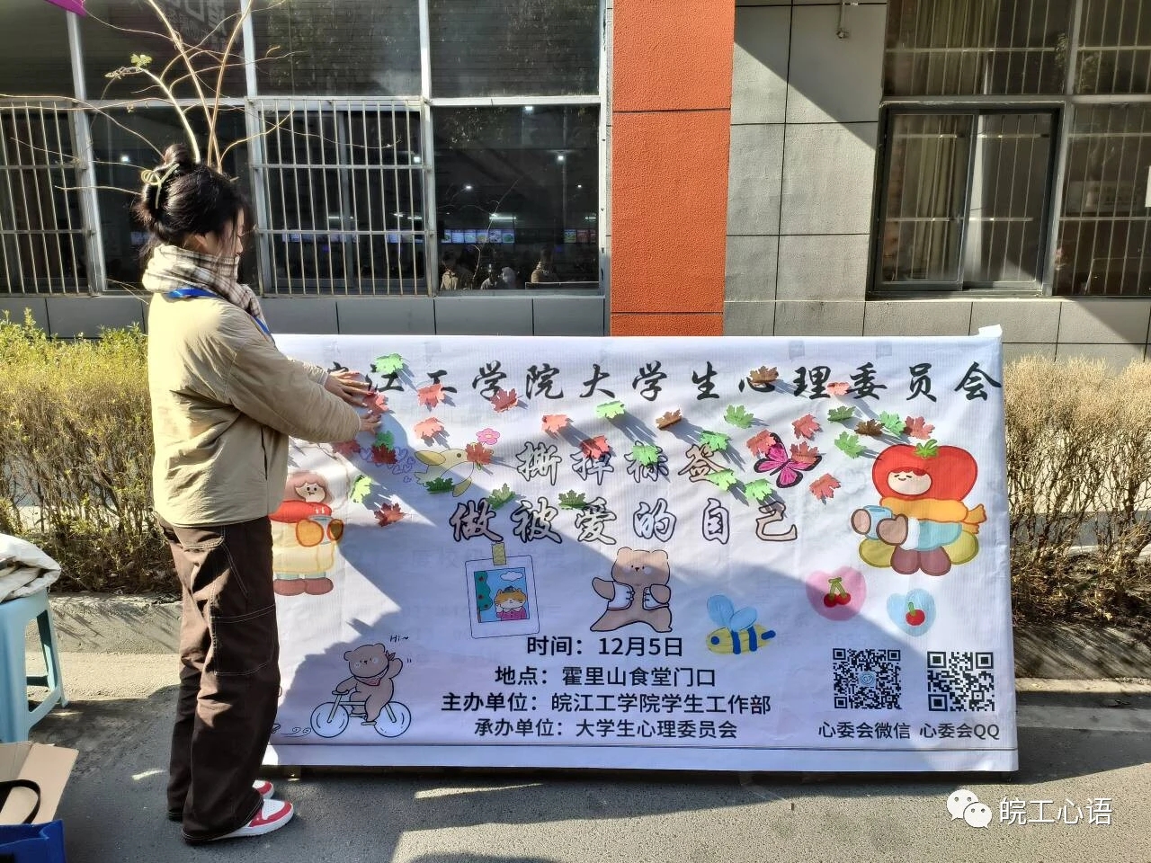 12月5日,大学生心理委员会在霍里山校区开展以“撕掉标签,做被爱的自己”为主题的心理健康教育活动。活动旨在通过撕掉标签的形式,让同学们重新认识自己,发现自己的价值和潜力,并勇敢地追求自己的梦想。以自我认知范畴中的“自我标签”为切入点,引导学生客观,积极,多角度地重新审视消极的自我标签,去发现更好的自己。吸引了众多同学参与。