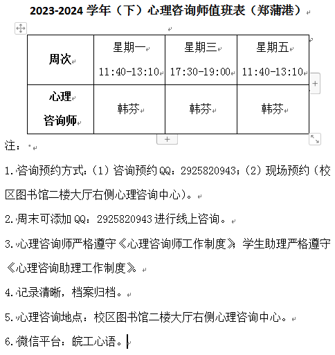 - 上一条2023-2024学年(下)心理咨询师值班表(郑蒲港)2024-02-27 10:10:57