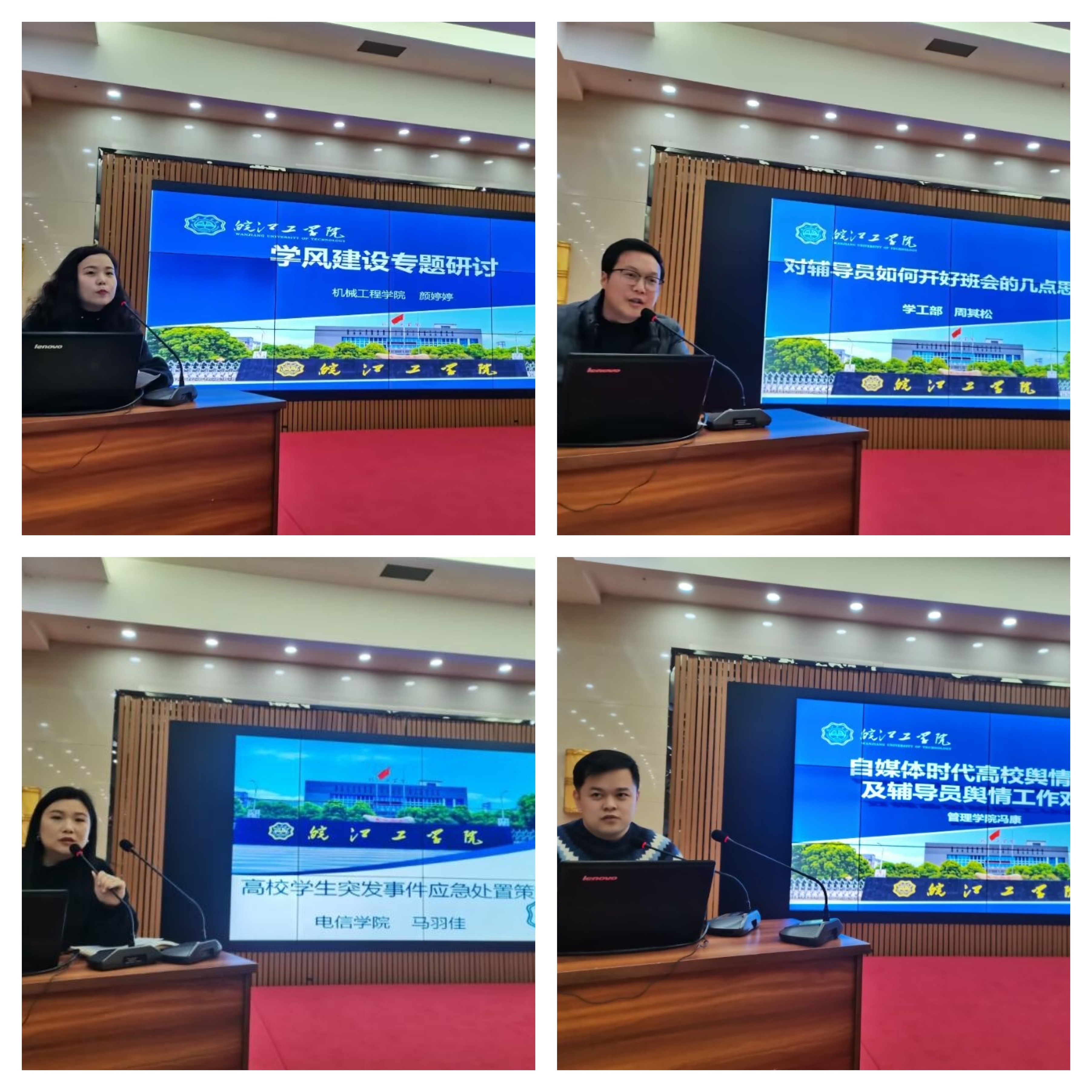 本次培训分别以学风建设、党建发展、班会安排、班级建设、宿舍建设、突发事件和舆情管控等专题进行,并对资助、心理、就业、学生服务、留学服务和学生活动等方面向辅导员们做了相关政策解读和工作流程的培训。