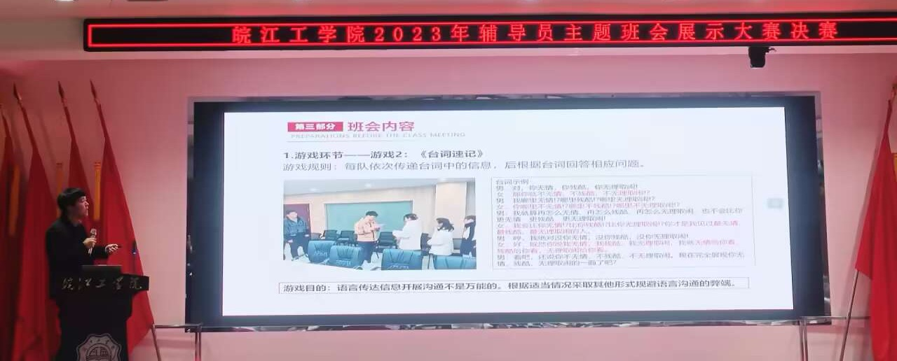 本次大赛经过认真筹备,在初赛和复赛的基础上,共有11名辅导员老师脱颖而出。比赛中,每位参赛选手自选主题,根据学生工作整体部署,结合所带专业班级的实际情况,规范学生教育管理,围绕学生干部的沟通技巧、树立正确恋爱观、诚信考试、拒绝拖延症、校园防诈、时间管理、职业规划、心理健康等主题,结合自身专业特点和优势特长,巧妙运用歌曲、视频、师生互动等手段,饱含热情地为大家带来了一堂堂主旨鲜明、理论深刻、风格多样的主题班会。参赛选手通过主题班会全面贯彻党的教育方针,落实立德树人根本任务,引导学生坚定理想信念,勇担时代重任,争做奋发有为的新时代青年。