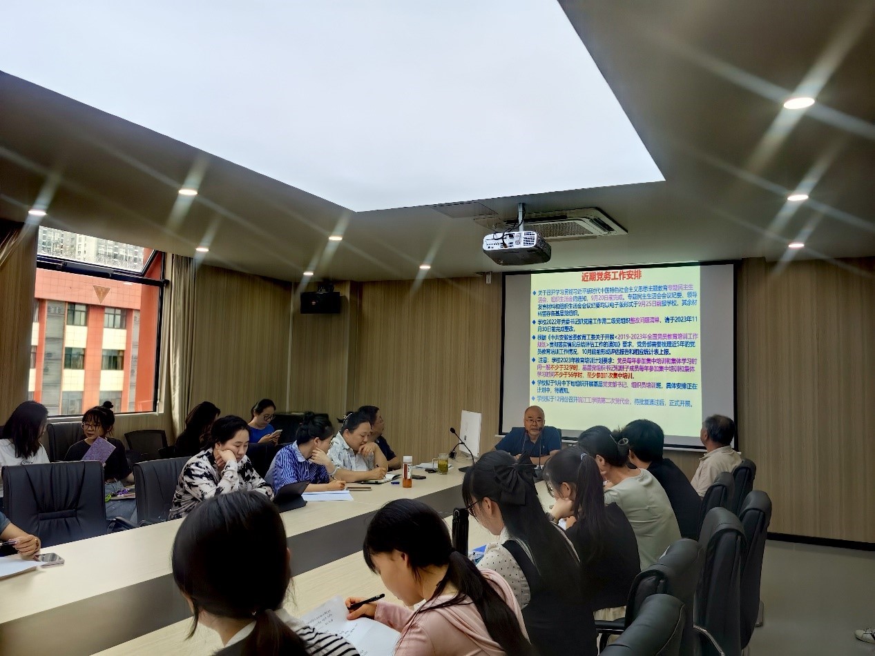 学院党委书记张勤对近期的党务工作进行了详细安排。他传达了学校近期有关党务工作的工作提示和工作要求,带领全体教职工学习了“习近平致全国优秀教师代表的信”,并针对学习贯彻习近平新时代中国特色社会主义思想主题教育文件的相关要求向全体教职工进行了讲解。他强调了党务工作的重要性,对全体教职工提出了具体要求,希望大家积极参与和支持学院的各项党务工作。