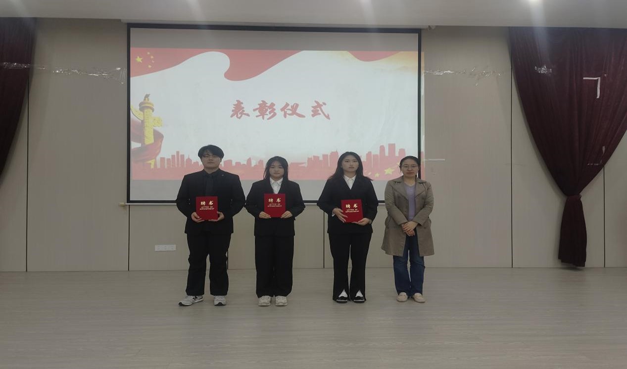 随着两届主席的交旗交章仪式的结束,标志着第五届学生会正式接过发展财经学院的接力棒。接着大会进入到了表彰仪式环节,由刘玉婕老师为第四届财经学院学生会主席团、部长级代表颁发聘书,并合影留念。