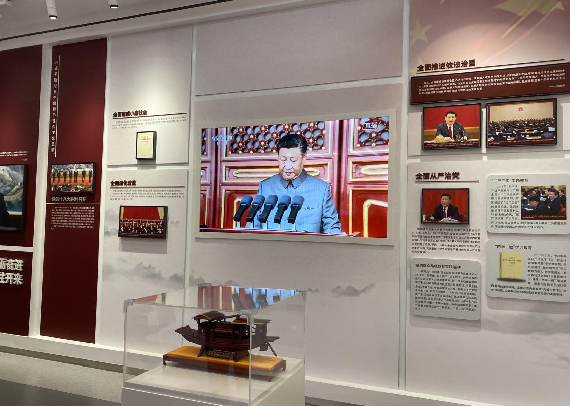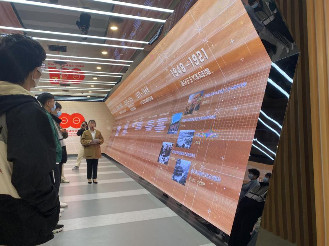踏入展厅,大屏幕中肃穆的党旗,背景墙上庄严的字迹,让红色的气息扑面而来。同学们跟随讲解员的脚步,走进了一条记录中国共产党百年历史的“时光隧道”,“隧道”两侧的屏幕上清晰记录了我党百年历史中的重要时期和事件。主屏幕中播放的一部展现我市经济社会发展辉煌成就的纪录片,带领每一位同学回顾了中国共产党党史和马鞍山革命史,再次感受了百年大党的光辉历程和伟大成就。