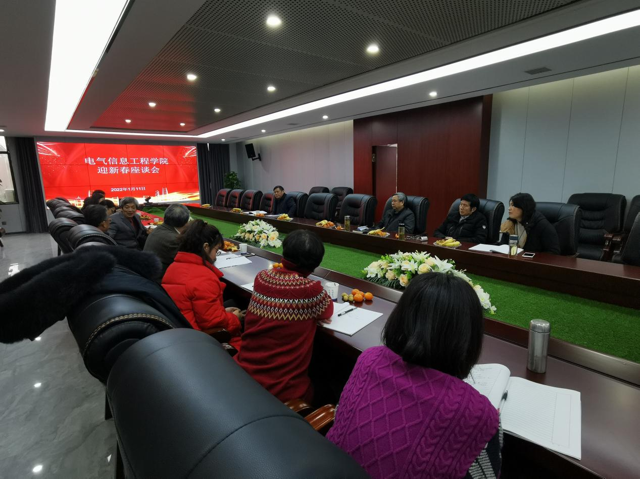 2022年1月11日下午,电气信息工程学院迎新春座谈会在行政楼417会议室举行。校长吴继敏,副校长汪光阳、张建民、朱建芬等校领导出席了会议,电气信息工程学院党政班子成员,各专业负责人及各教研室主任参加了座谈会。会议由学院总支书记杨安胜主持。