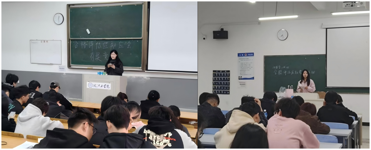 学院依托“学习通”数据平台,发布“合格评估应知应会”测验。试题紧扣评估要点,全面考察学生对校史校情、评估目标、行为规范等知识的掌握情况。根据答题成绩与用时评选出前20%的学生发放小礼品。激发了学生的积极性与荣誉感,鼓励学生要以实际行动展现良好学风,为学校争光添彩。