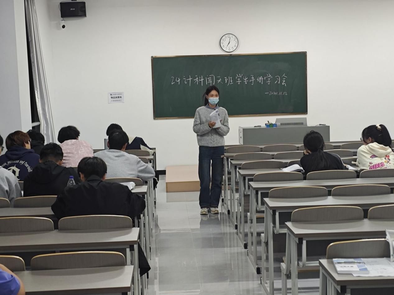 为引导新生更快地融入大学生活,提升学生遵守校规校纪意识,2024年11月12日晚,计算机与人工智能学院面向全体2024级新生开展《学生手册》专题学习活动,此次活动由2024级辅导员周娓、邵婉婉、濮楠楠分专业主讲。