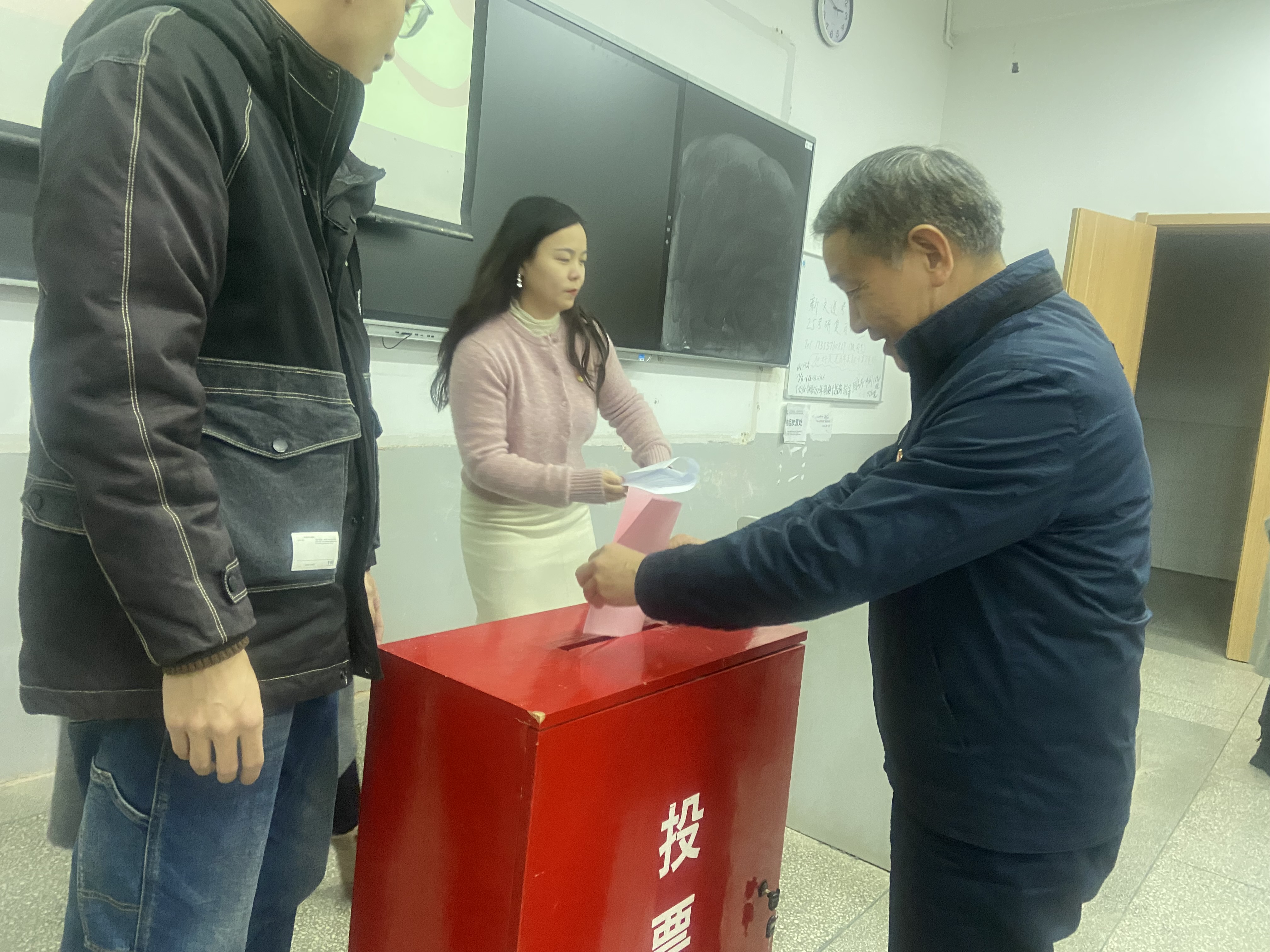 换届选举大会开始,党总支书记张建民对上届党总支的工作情况做了详细地汇报,副书记颜婷婷公布换届选举办法,大会审议了工作报告和选举办法,宣布了新一届的党总支委员名额和候选人名单。同时提出监票人和计票人人选,由具有表决权的党员表决选出监票人栾阔、牧运婷,计票人付雅囡、汪娟、汤琪。全体党员认真填写选票后,走到票箱前郑重投下自己的一票,现场气氛热烈庄重,投票工作规范有序。通过无记名投票方式,选举产生了张建民、朱天宇、颜婷婷、戎慧敏、陈田、梁晓玲为新一届总支委员会委员。