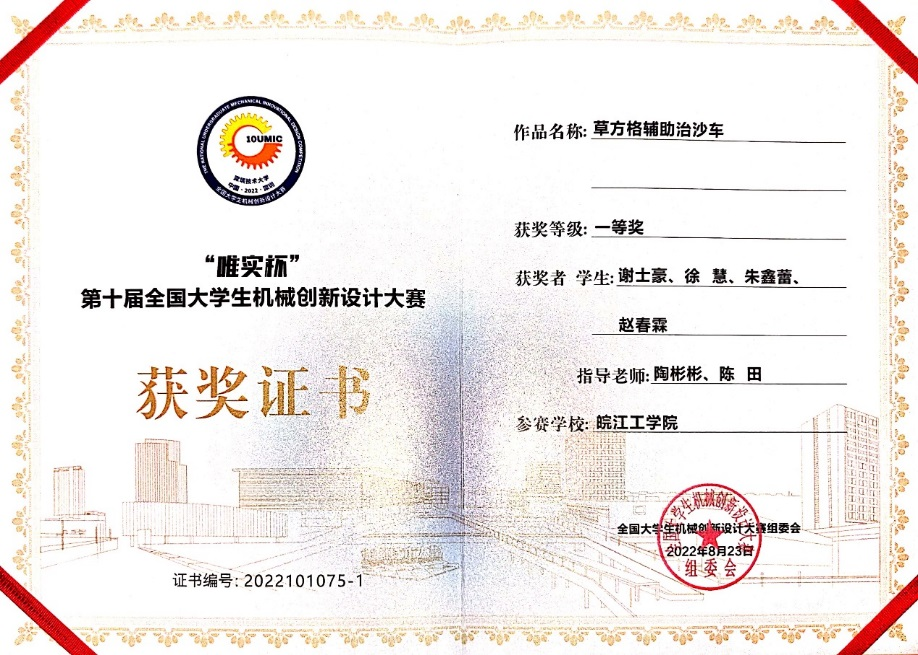 机械工程学院以班主任制度为抓手,以实验室全面开放为支撑,以大学生科技创新协会为平台,以大学生科技创新活动为中心,以科协培训为手段,构建五位一体创新创业教育体系,组织学生参加全国大学生机械创新设计大赛、大学生先进成图技术与产品信息建模创新大赛、HONDA中国节能竞技大赛、大学生智能车大赛、大学生工程训练综合能力竞赛、“互联网+”创新创业大赛、“挑战杯”中国大学生创业计划竞赛、大学生数学建模竞赛等多项赛事,获国家级奖励50余项、省部级奖励100余项。2022年8月,第十届全国大学生机械创新设计大赛决赛在深圳技术大学举行,学院谢士豪、徐慧、朱鑫蕾等同学参与完成的作品《草方格辅助治沙车》最终斩获全国一等奖,创下了学校在该项赛事历史上的最佳成绩。值得一提的是,18新利怎样是安徽省首位入围该项国家A类顶级赛事并取得一等奖的民办高校!