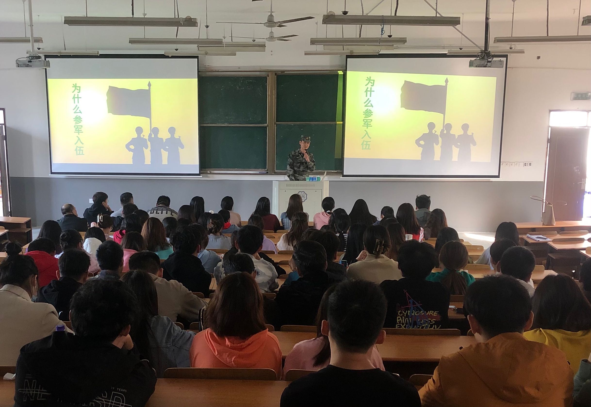 接下来由退伍大学生左梦杰,以视频的形式向大家分享了他在部队里面的生活作息以及日常训练。通过自己在部队的成长经历以及各方面的收获为新生讲述了军旅生活对自己的磨练与培养,表示部队生活丰富了他们的生活经历,培养了他们顽强的韧性,丰富的内容极大地激发了同学们的兴趣。然后,退伍大学生陈磊为学生们详细介绍了入伍的好处以及各项优惠政策,并告诉同学们当兵不仅仅可以强身健体、保家卫国,更能够磨炼自己的意志,增强自己的责任心和民族荣誉感。最后两位光荣的退伍军人和同学们分享了自己在部队生活的点点滴滴以及和战友的真挚感情。