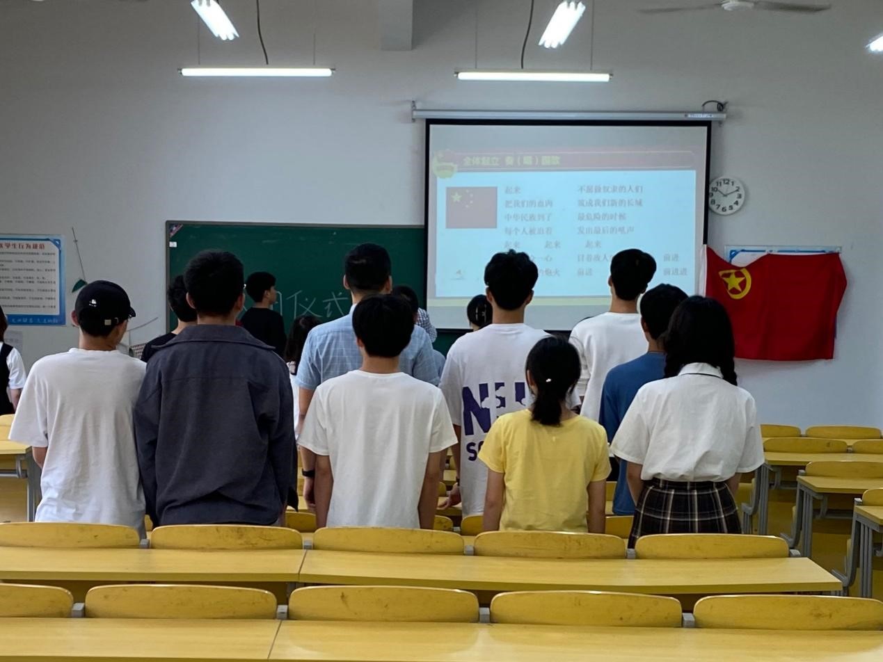 活动开始,随着音乐的奏起,团员们齐唱国歌。奏唱完毕,主持人邵帅宣布了新团员的名单,随后新团员们将团徽佩戴在胸前,由团组织负责人张嘉龙同学带领宣誓。