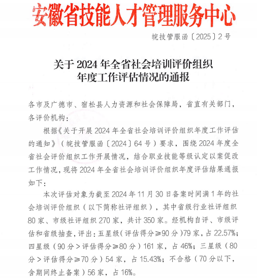 近日,安徽省技能人才管理服务中心发布《关于2024年度全省社会评价组织年度工作评估情况的通报》,我校荣获“2024年度五星级社会评价组织”,这也是我校自2023年以来开展职业技能等级社评首次获得五星级荣誉。