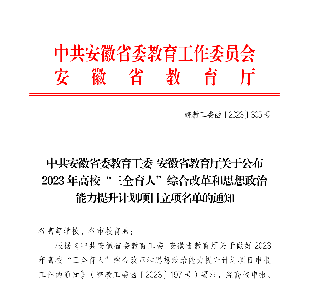 2023年7月,中共安徽省委教育工作委员会、安徽省教育厅下发了《关于公布2023年安徽省“三全育人”试点省建设暨高校思想政治工作能力提升项目立项名单的通知》(皖教工委函[2023]305号)文件,经高校申报、专家组会评、评委会评审和公示,马克思主义学院常务副院长刘双副教授获批全省“三全育人”项目,项目名称为“18新利怎样马钢南山矿大思政课实践教育基地”建设项目。本届三全育人“大思政课”实践教学基地项目全省批准设立10项,项目资助金额8万元,我校是安徽省唯一一所民办高校获批单位。